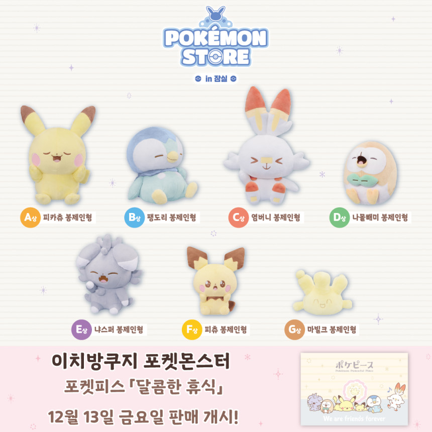 안녕하세요! 이번주 금요일부터 잠실에서 포켓몬 팝업스토어가 열립니다. 잠실 롯데월드몰 지하 1층 팝업매장에서 열린다고 하는데요. 다양한 봉제인형부터 이치방쿠지까지 엄청난 md 리스트가 올라왔습니다. 포켓몬 팝업은 12월 13일부터 내년 1월 6일까지 운영될 예정인데요. 팝업스토어 매장 앞에 엄청난 것 또한 준비된다고 합니다. 이 엄청난 것은 아마 곧 올라올 것 같습니다. 이치방 쿠지는 포켓몬스터 포켓피스 달콤한 휴식인데요. A상부터 L상까지 매우 다양합니다. 이 이치방 쿠지는 보통 수량이 정해져 있기 때문에 관심있으신 분들께는 오픈런을 추천드립니다. 크리스마스 이브 부터 판매하는 MD도 있으니 천천히 살펴보시고 원하시는 MD를 가지시길 바랍니다.