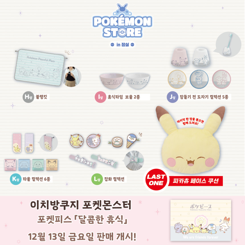 A상 피카츄 봉제인형, B상 팽도리 봉제인형, C상 염버니 봉제인형, D상 나몰빼미 봉제인형, E상 냐스퍼 봉제인형, F상 피츄 봉제인형, G상 마빌크 봉제인형, H상 블랭킷, I상 휴식타임 보울 2종, J상 잠들기 전 도자기 컬렉션 5종, K상 타올 컬렉션 6종, L상 잡화 컬렉션, 라스트 원상 피카츄 페이스 쿠션